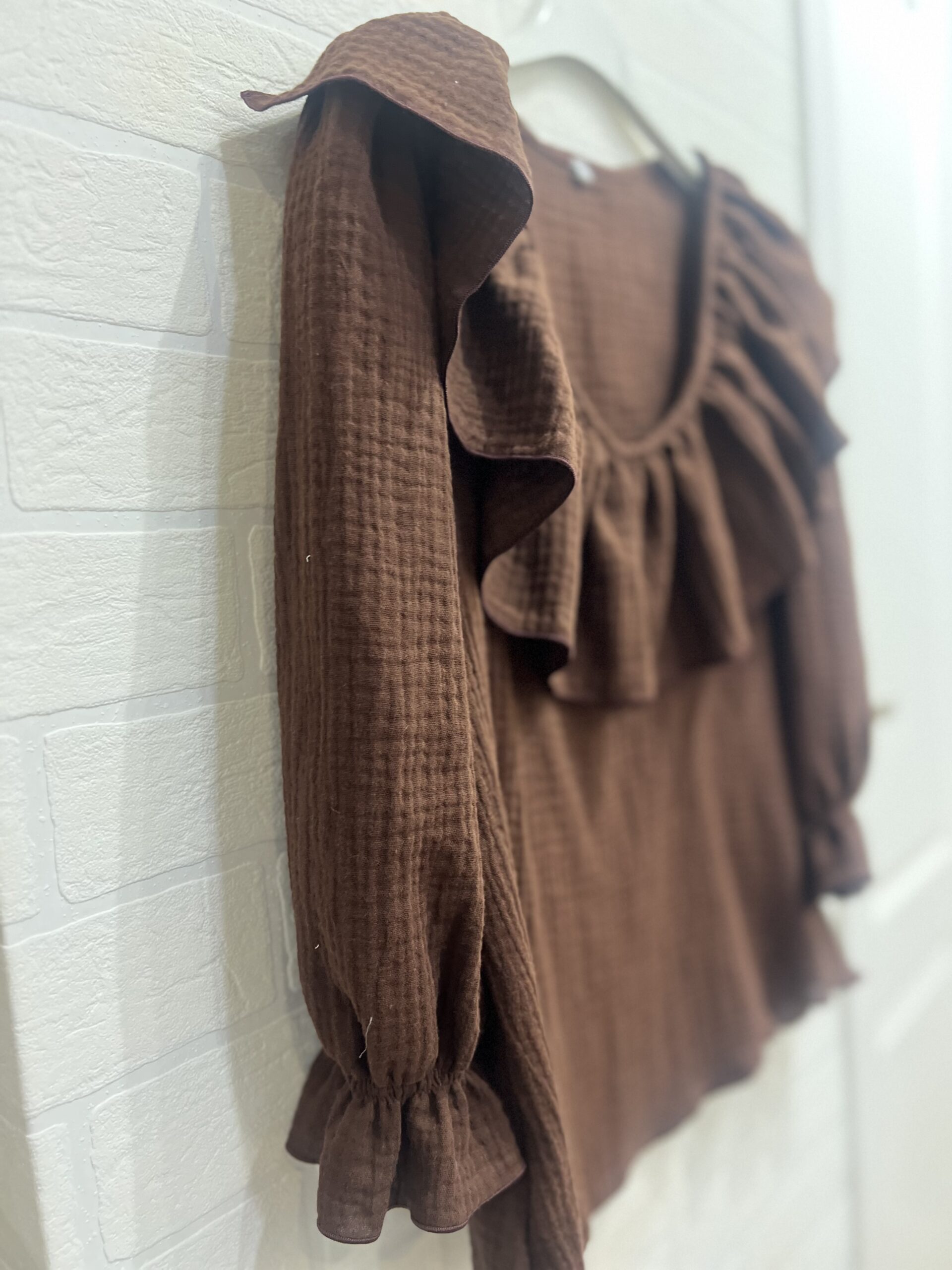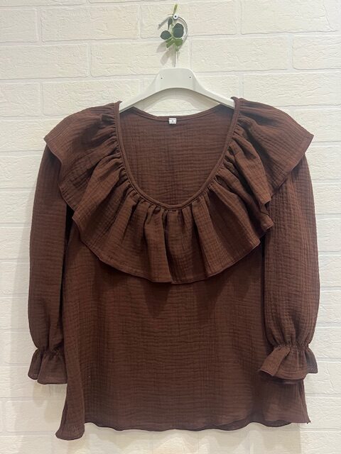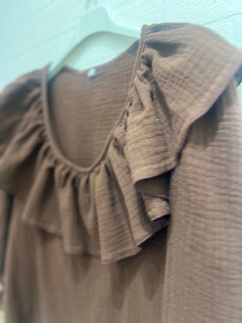 Manga francesa y con protagonismo un amplio volante en escote semi pico.