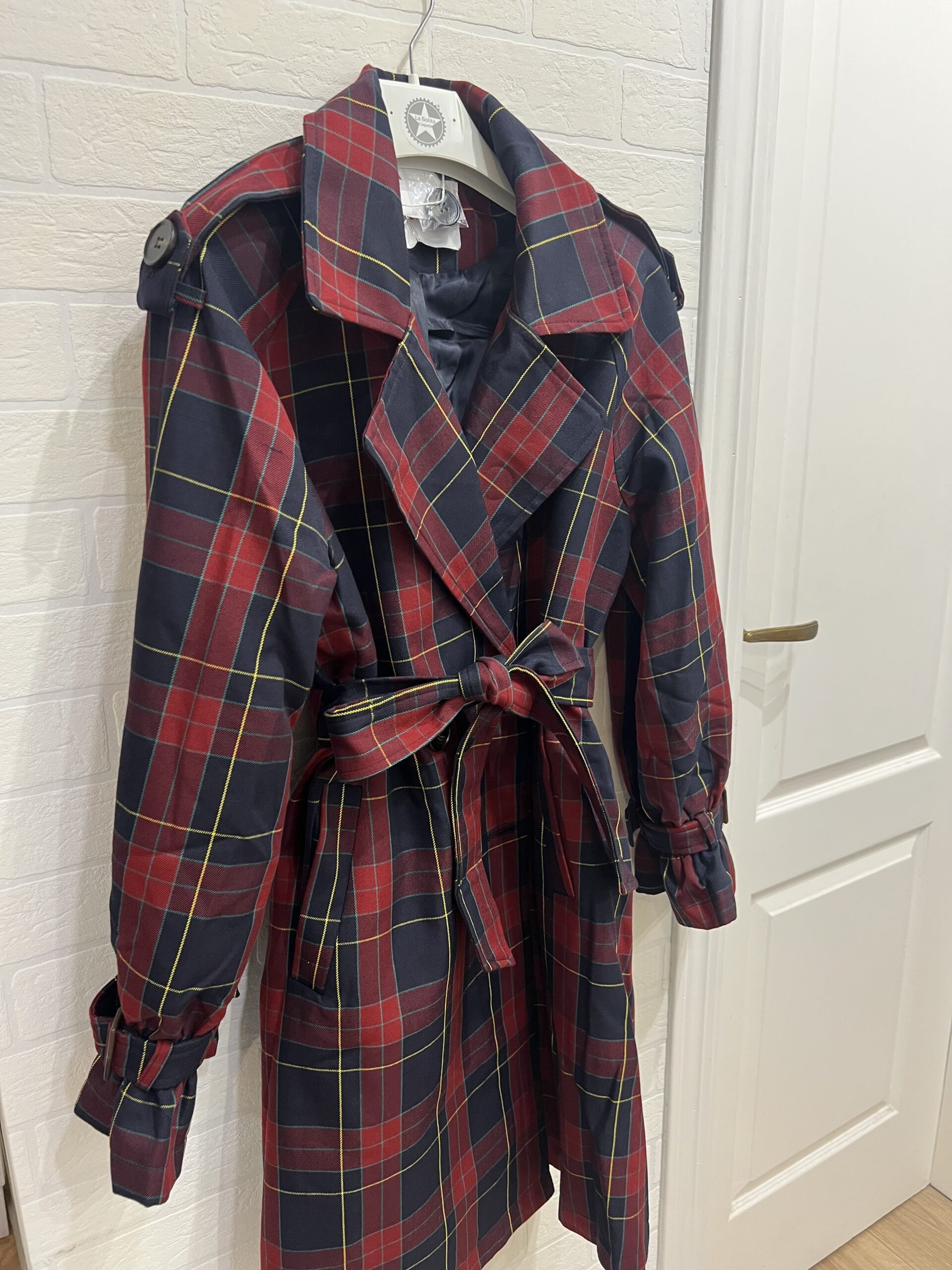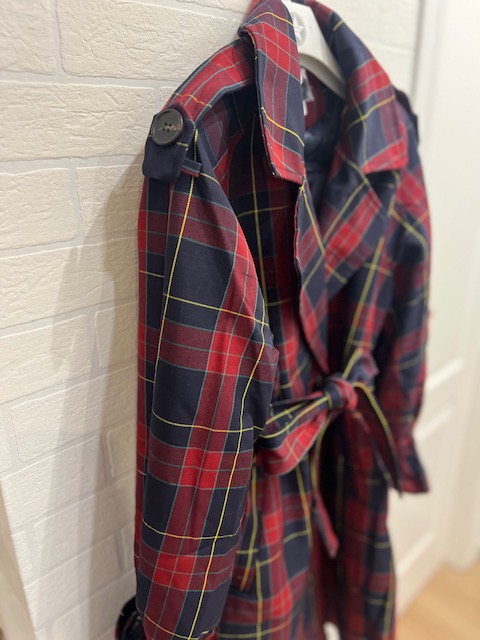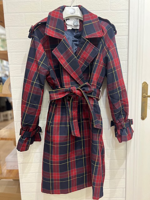 Una gabardina ideal en tartán rojo marino granate y línea mostaza.